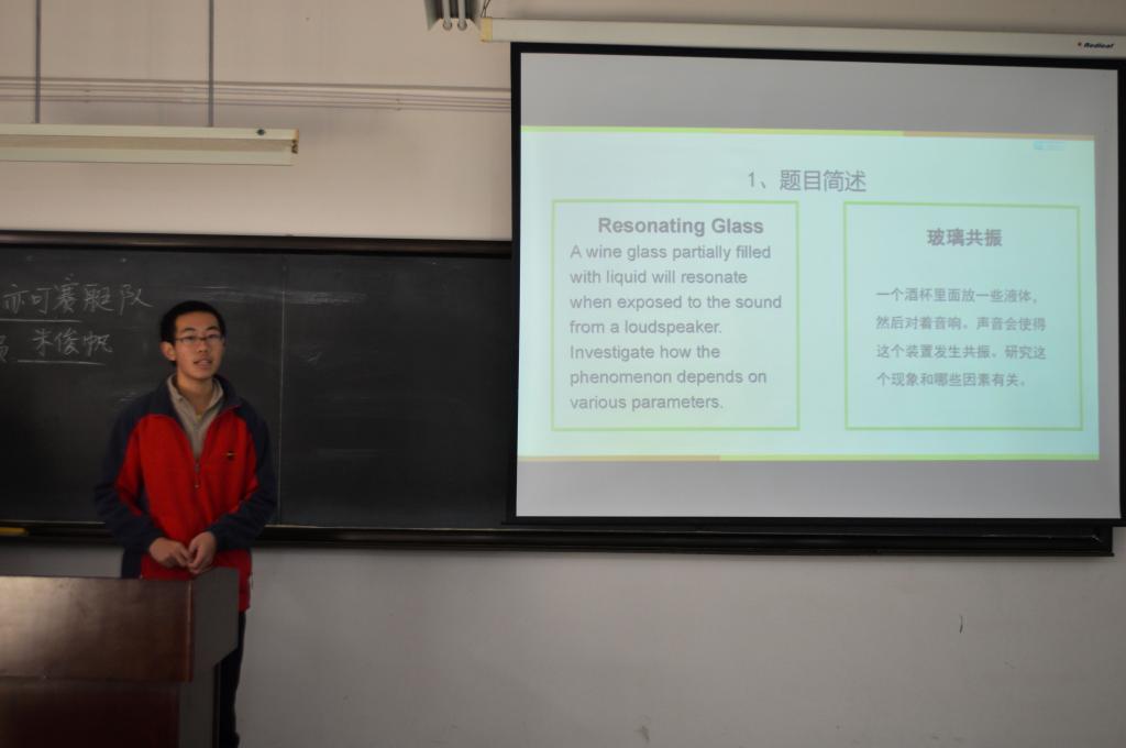 此次分赛共有17支队伍参加,第三轮分赛题目为“Resonating Glass”,本次比赛同学们就半满的酒杯会与扬声器发出的声音共振,研究相关参数是如何影响这个现象的展开答辩。到场参与评分的评委老师有校大学物理实验教学中心的滕永杰老师、白洪亮老师等。