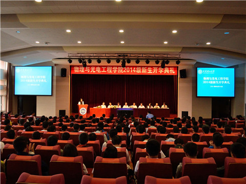 9月16日下午,物理与光电工程学院14级新生开学典礼于西综B301成功举行。出席本次典礼的有物理与光电工程学院院长赵明山,党委书记刘金远,副院长、大珩1401班班主任周玲,副院长丁洪斌,副院长兼党委副书记常亮,党委副书记兼副院长杨木,物理系主任、应用物理学专业负责人宋远红,光电中心系主任、光电信息与工程专业负责人潘路军,电子科学与技术专业负责人胡礼中,青年教师代表王正汹,研究生辅导员王文春,学院办公室主任于艳敏,党委组织员兼学生工作办公室主任李一鸣,2014级本科生班级班主任代表以及本科生教务员、学生工作办公室各辅导员;此外,2014级全体本科生新生、研究生新生参加了本次典礼。