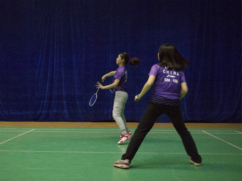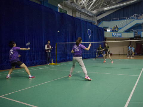 物理学院首先对阵建设工程学部。男单赛场上不时传来赢球时的呐喊,虽然比分上稍稍落后建工学部,但并这没有影响物理的队员们为集体争光的团队精神。男子双打,女子双打,混合双打依次在不同场地进行,团体项目要求队员们讲求合作。比赛开始后,物理的队员们很快进入状态,利落地抽球、扣杀让对手措手不及。小小的吊球充分体现了以柔克刚的道理。
