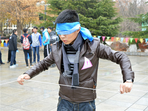 号称为史上最烧脑比赛的“三一训练营”从参赛者分组就开始为这微有细雨的广场升温,全体参赛的同学以边打招呼边猜拳的形式排成长龙,趣味感与温馨感,在“同学你好”这个环节里就已充盈了整个集体。在报数分组之后,由随队负责人带领各自的队伍,经历过自我介绍和贴铭牌,便开始准备迎接接下来各项团队竞争比赛的考验。首先来袭的“机智的盲人”比赛,虽形式简洁,却是给大家团队合作能力的大挑战。各队需要在全体蒙眼的情况下将一条被随机比例分配的长绳拼成正方形。在一阵或凌乱或井然,或紧张或欢快的沟通里,各个队伍都依次完成了任务,揭下眼罩的那一刻,他们满脸的笑容亦是团队一大步成长的见证。